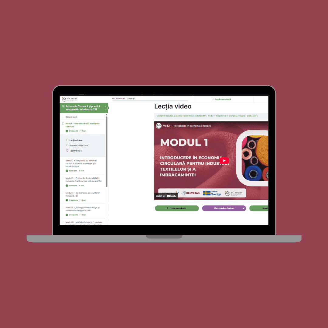 Acest curs digital interactiv a fost creat tocmai pentru a răspunde acestor provocări. El oferă o bază solidă pentru a înțelege și aplica principiile economiei circulare în industria textilelor și a îmbrăcămintei. Este structurat în 9 module, cu o durată totală de aproximativ 6 ore, accesibile oricând și de oriunde, în ritmul tău propriu. Cursul include materiale video explicative și resurse utile pentru aprofundare și aplicare practică.