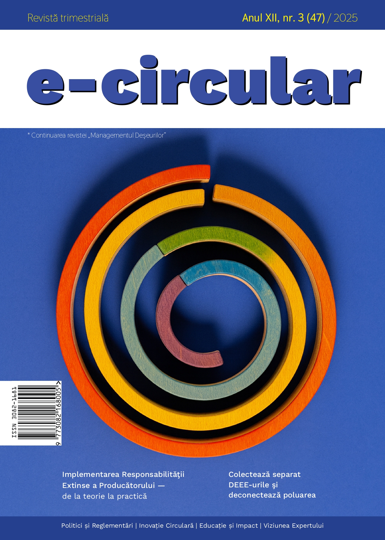 Revista E-Circular este o publicație trimestrială dedicată economiei circulare, sustenabilității, inovațiilor verzi și tranziției spre o economie cu emisii reduse. Continuând tradiția revistei „Managementul Deșeurilor”, E-Circular promovează o abordare modernă, orientată spre valorificarea resurselor, prevenirea risipei și consolidarea culturii circularității în Republica Moldova și la nivel regional.